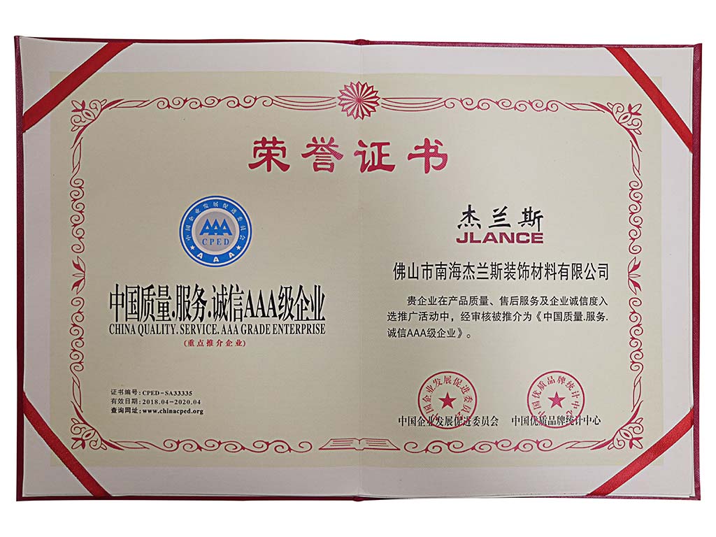 杰蘭斯裝飾材料有限公司秉承“以人為本、科技為先”的經(jīng)驗理念,堅持規(guī)?;\作,規(guī)范化經(jīng)營的發(fā)展思路,建立了完善的營銷網(wǎng)絡(luò)及高素質(zhì)的銷售隊伍,擁有一支豐富經(jīng)驗的設(shè)計團(tuán)隊,專門配合建筑裝飾材料的深化設(shè)計及工藝構(gòu)思,品牌精益求精理念,高品位的產(chǎn)品、良好的質(zhì)量與精湛的工藝,建立了良好的口碑.